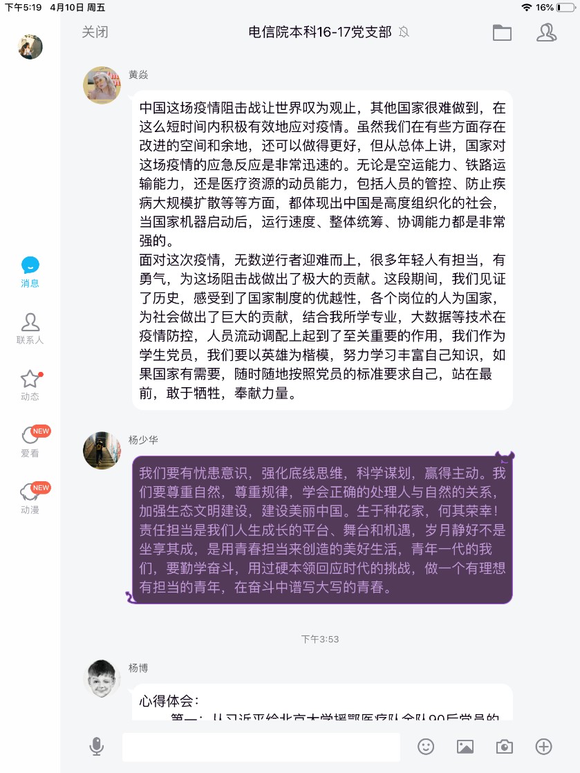 全体党员积极参加此次活动,分享了最近几月在家抗疫的心路历程,并在活动结束后分享了收获和体会。同志们表示,青年一代要有理想,要有本领,要有担当, 90后党员要找到自己的发光点,争取担当重任。一线医生,一线警察以及各类防控人员在这次疫情期间无私奉献,他们是父母,孩子,朋友,正是这样一群最勇敢最善良的人在保护着我们。中华上下五千年,源远流长。爱国主义,其中最重要的一点便是要维护自己的民族和国家的绵延生息,薪火相传,这便是我们最大的时代担当。习近平总书记说“武汉从来都是一座英雄的城市,武汉的人民从来都是英雄的人民。“坚持中国共产党的领导,充分依靠群众,科学决策,我们就一定能战胜困难,迎难而上!”